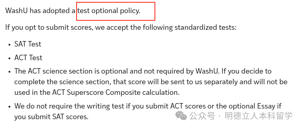 Washu将继续实行标化可选政策。对SAT或ACT考试成绩没有偏好。高中任何年份的考试成绩均可接受。