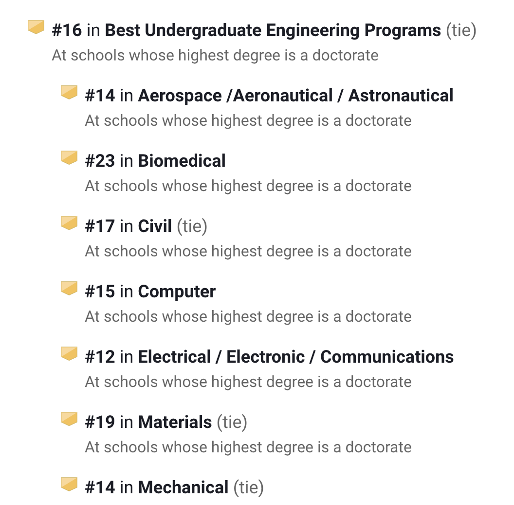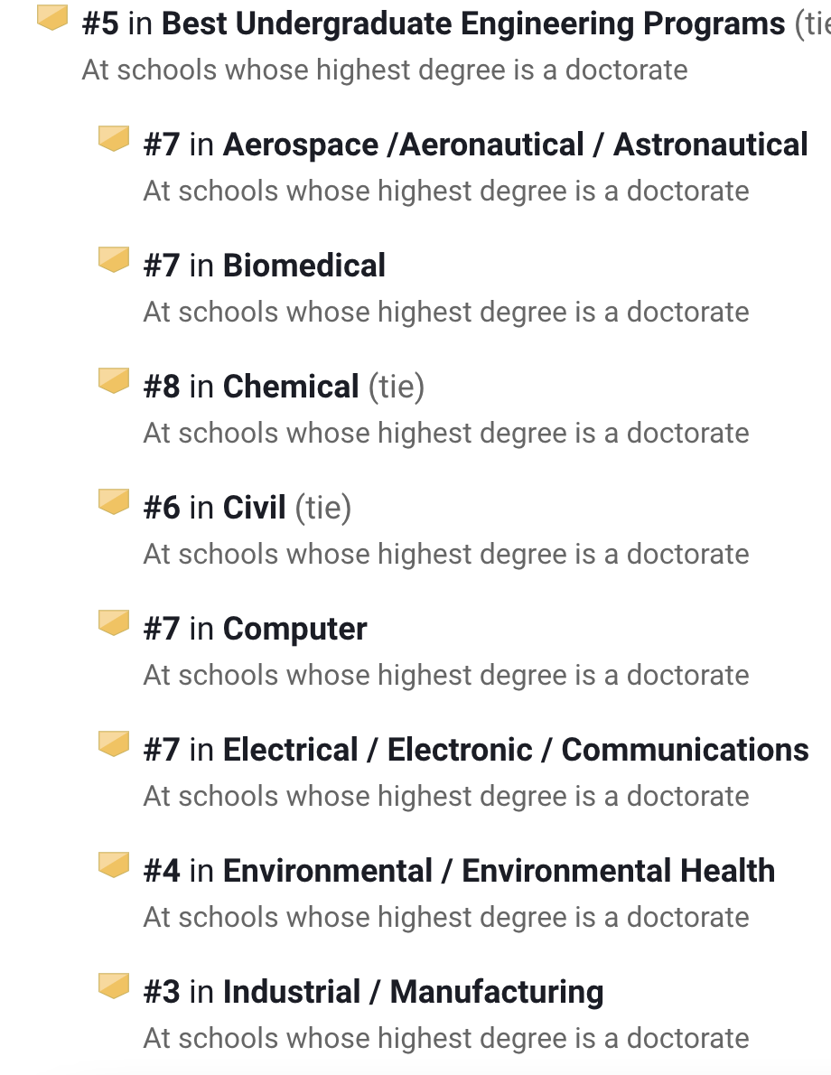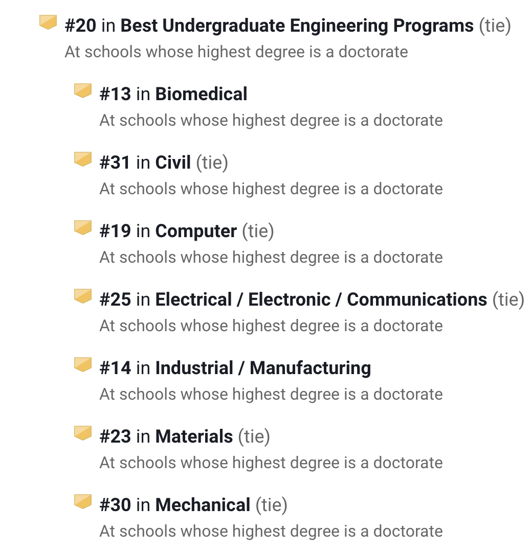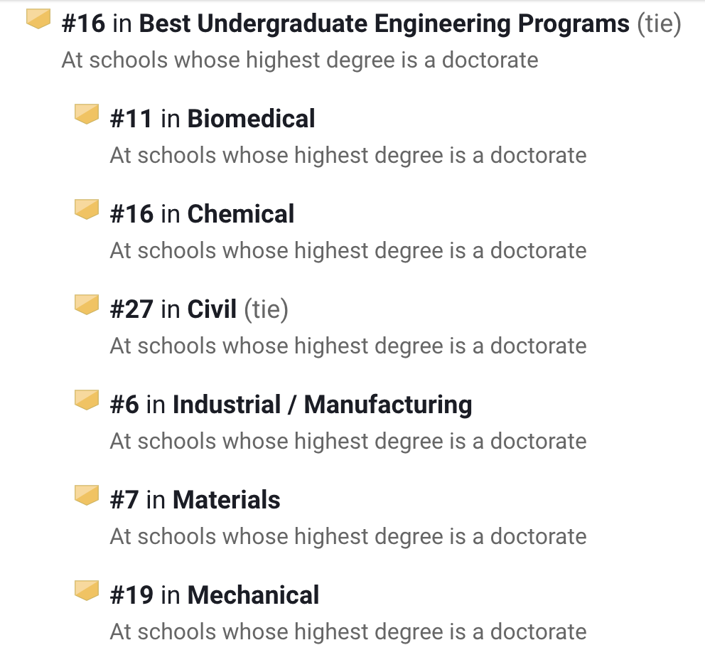 在U.S.News排名中,它的工程项目在全美第20,其中生物医学工程第13名、工业/制造工程全美第14。