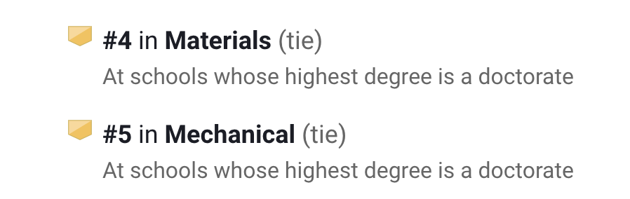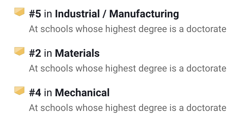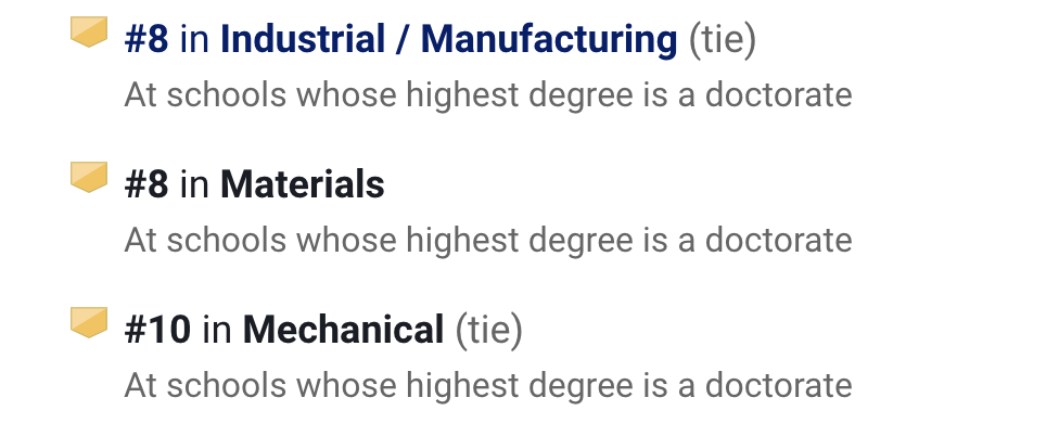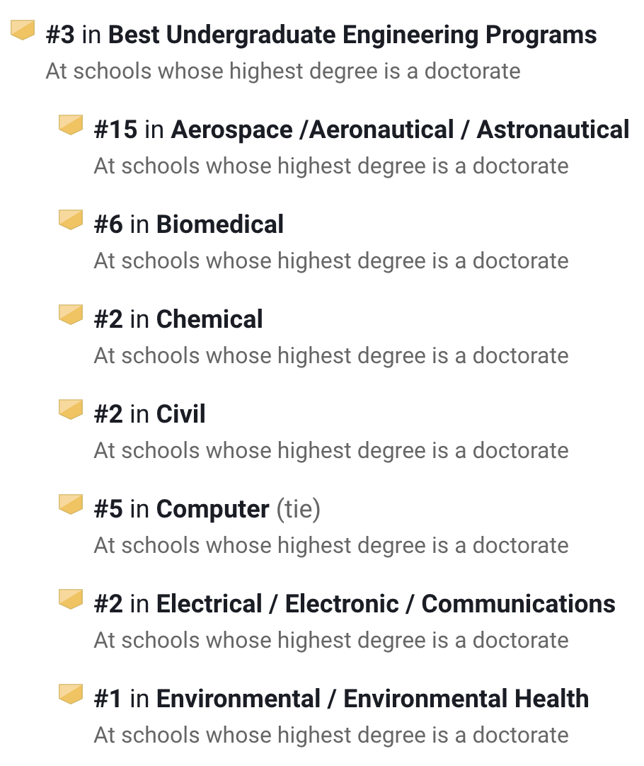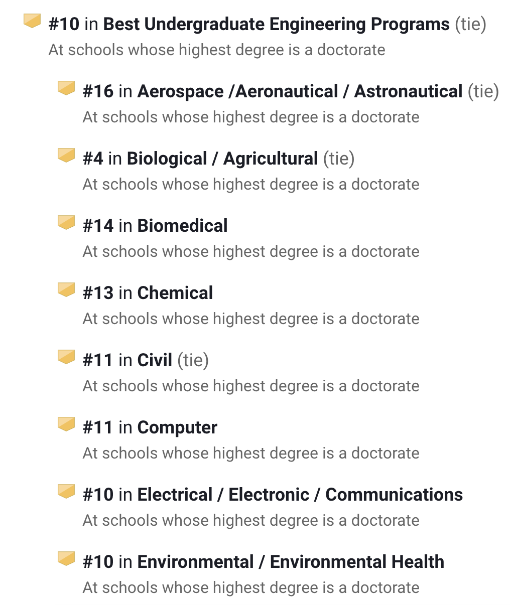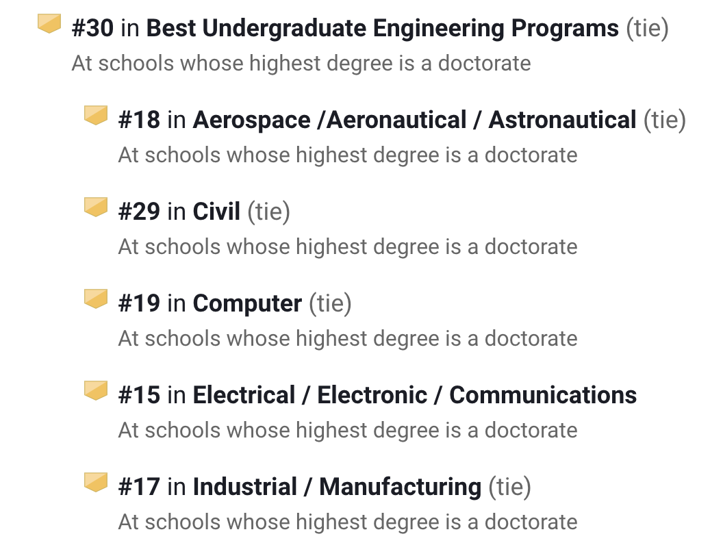 在U.S.News排名中,它的工程项目在全美第20,其中生物医学工程第13名、工业/制造工程全美第14。