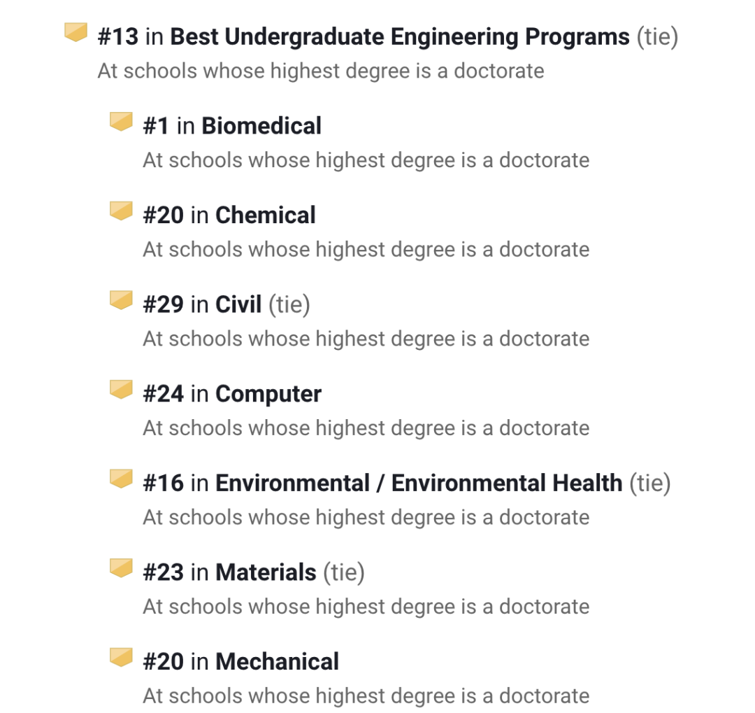 JHU在U.S.News全美最新本科工程项目中排名第13,其中: