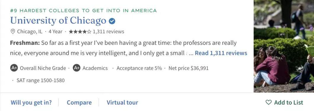 在Niche「全美学术最佳大学排名」和「全美最难进的大学排名」中,芝加哥大学分别位列第七和第九。