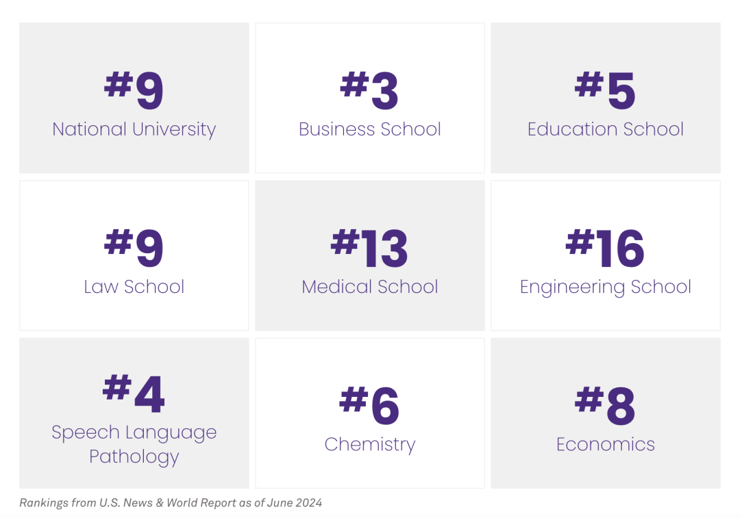 它被U.S. News连续四年评为全美排名前十的大学,拥有全美公认最好的新闻学院—Medill新闻学院,与哥伦比亚大学的新闻学院齐名。