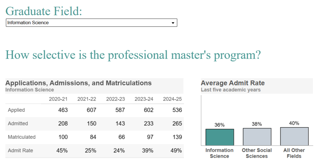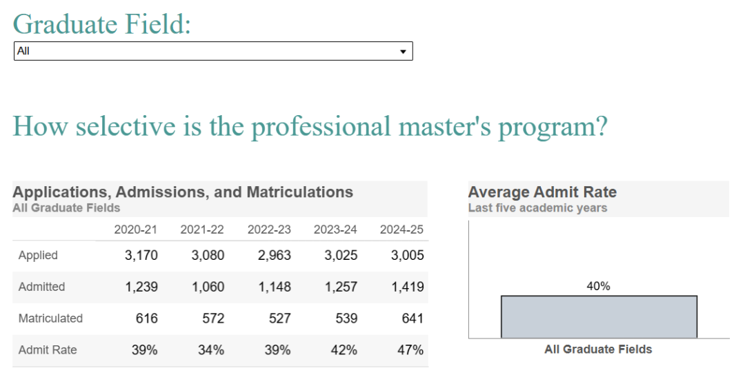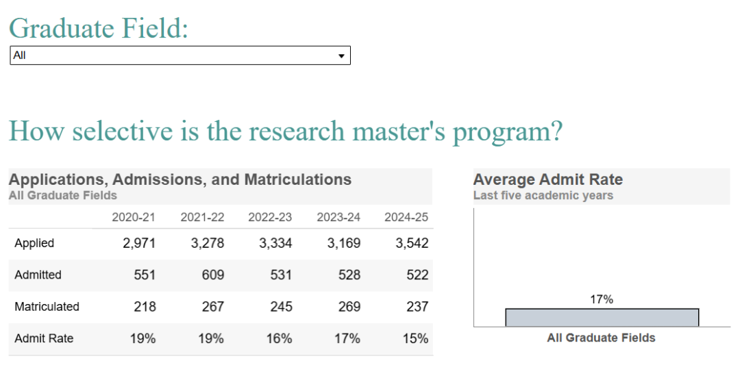 康奈尔大学研究生院开设MPS、MS、MA、Meng等多种学位,目前只有MPS、MS和PHD学位部分项目公布了录取率、入学率等信息。