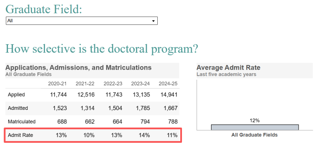 2024-2025年度,康奈尔收到了1.49万份博士研究生申请,录取了1667位同学,录取率达11%;