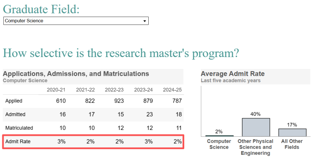 康奈尔有两个CS项目,一个是MS(理学硕士),一个是MEng(工程硕士),表格中展示的录取率是MS(理学硕士)的,工程硕士暂未公布录取信息。
