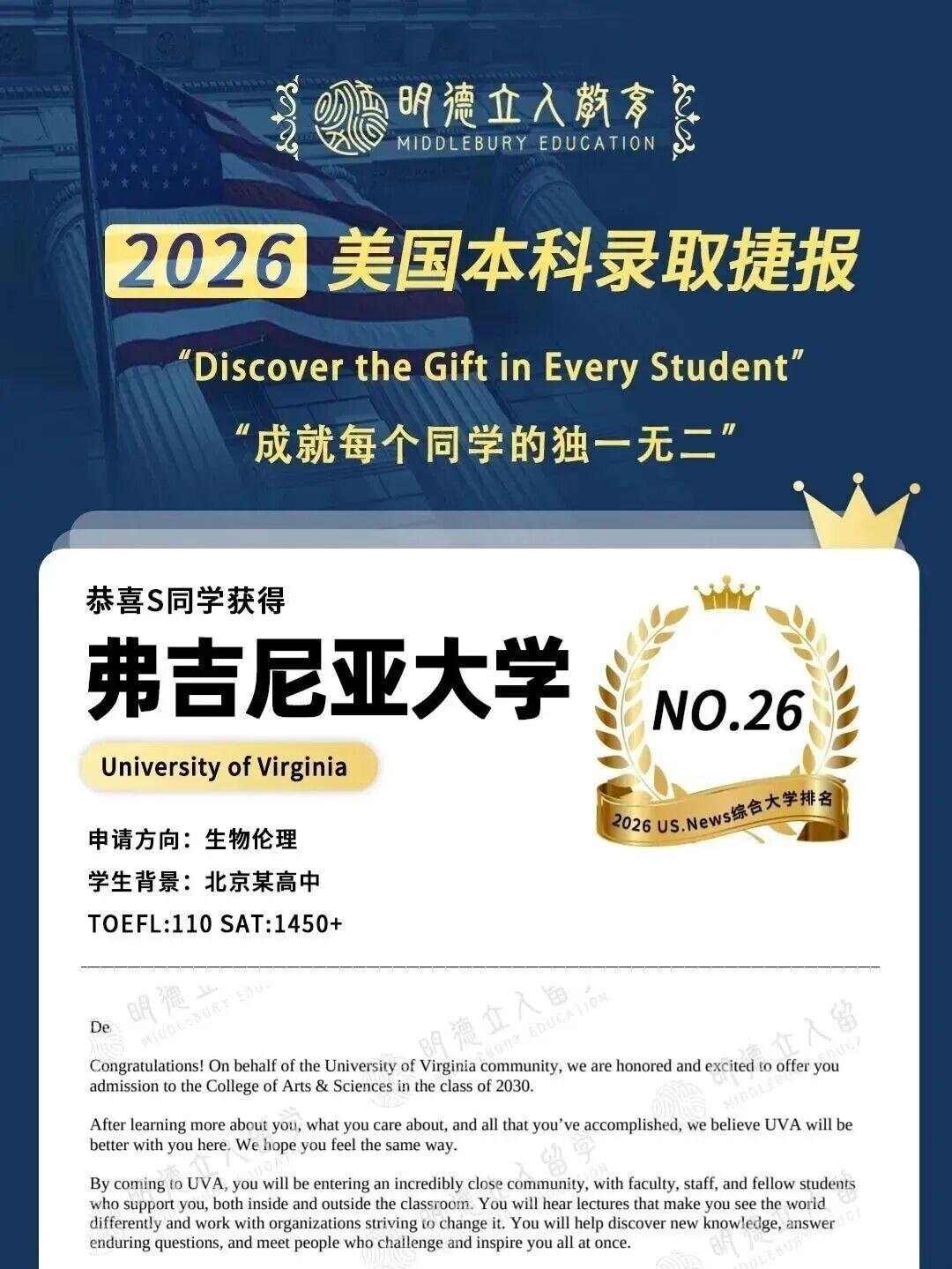S同学就是以这样的背景,在早申阶段拿到了弗吉尼亚大学(UVA)生物伦理专业的录取offer。