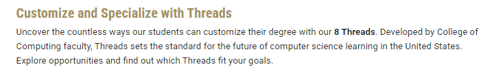 佐治亚理工学院在计算机科学学院下的CS专业,有面向8大方向的定制化和专门化课程(Thread)。