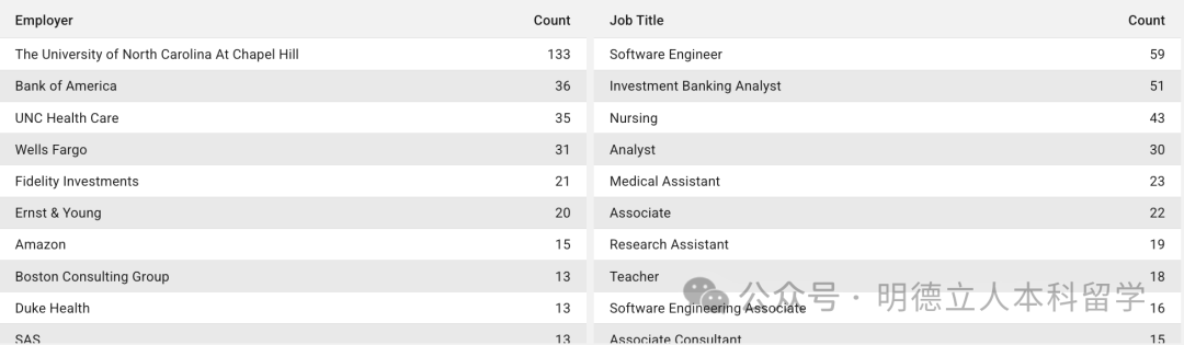 知名雇主包括:Capital one、摩根大通、贝恩咨询、麦肯锡、摩根士丹利、谷歌、微软、杜克大学(留校)。