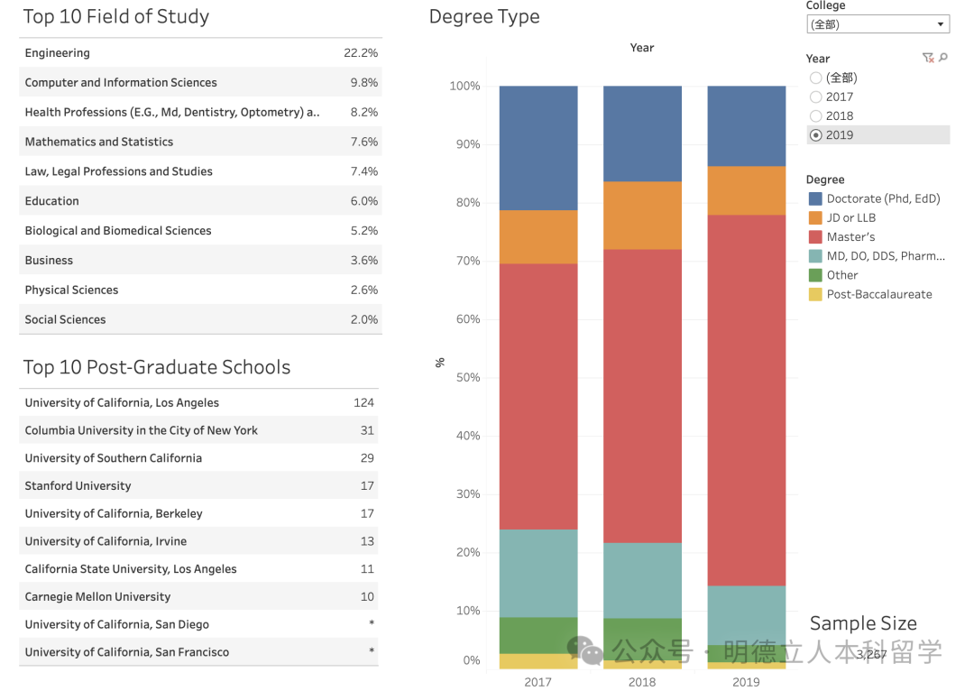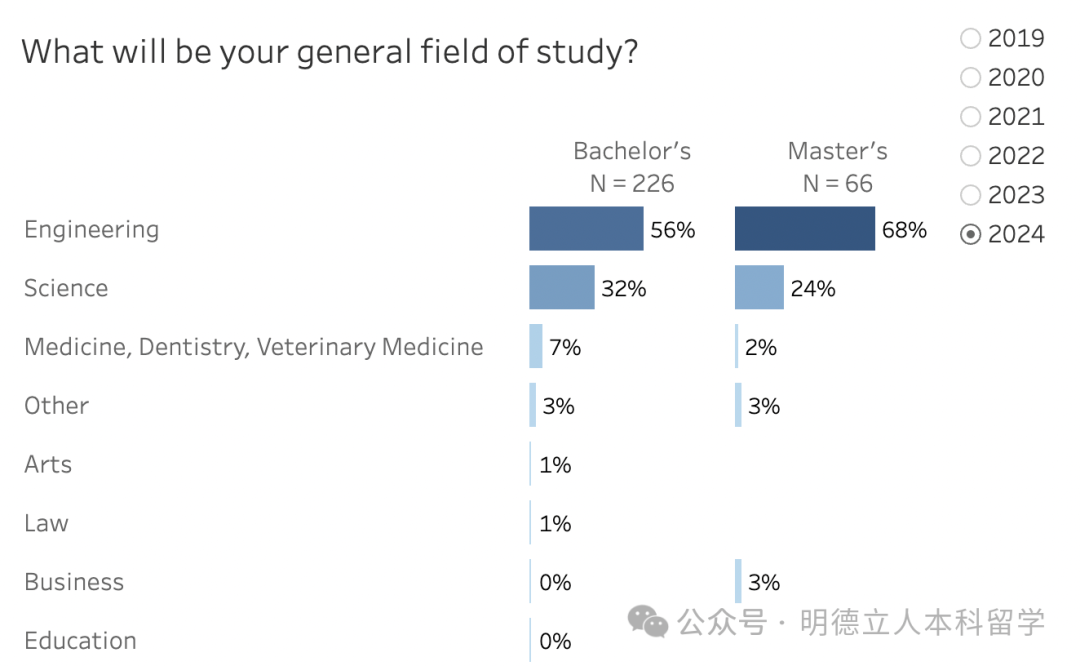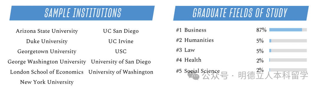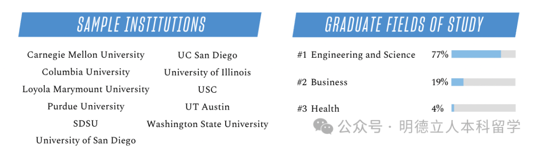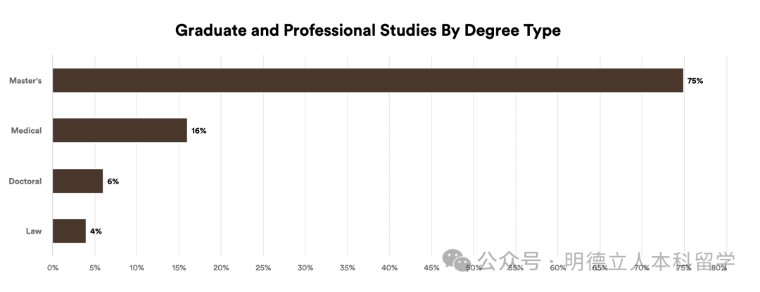 继续读研深造的学生,56%攻读的是工程学位,32%选择的是科学,入读的也都是顶级大学。