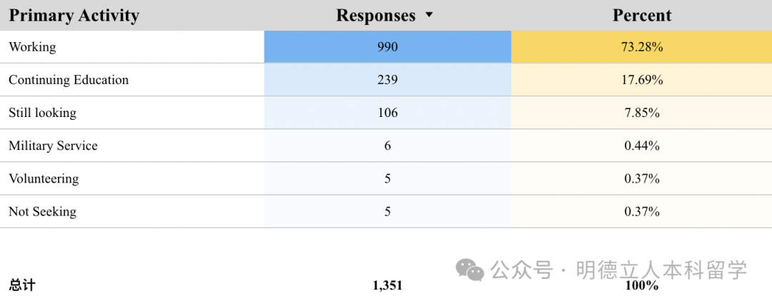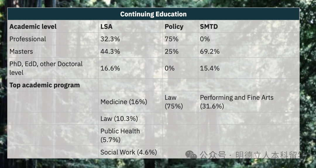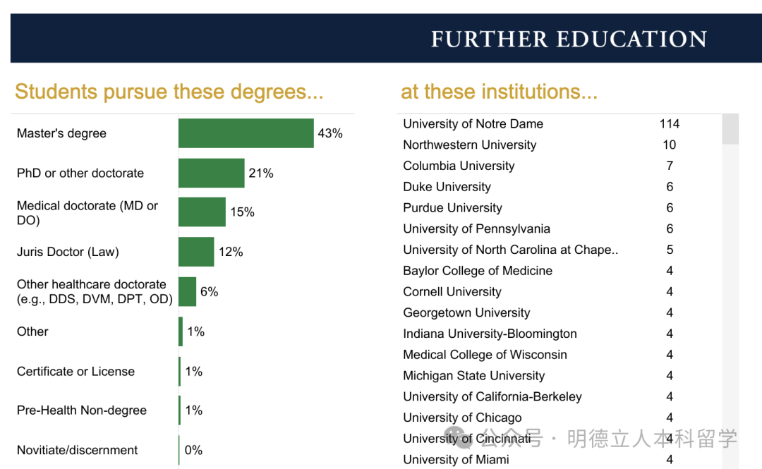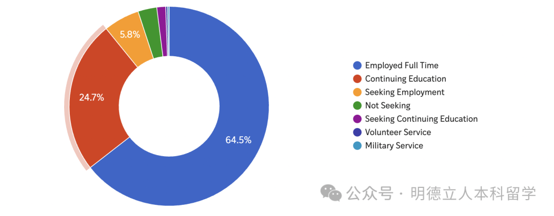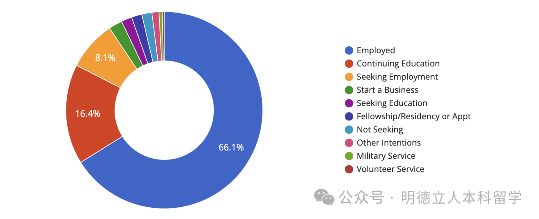 该学院的深造率为28.7%,医学(16%)、法律(10.3%)、公共健康(5.7%)、社会工作(4.6%)是选择人数最多的求学领域。