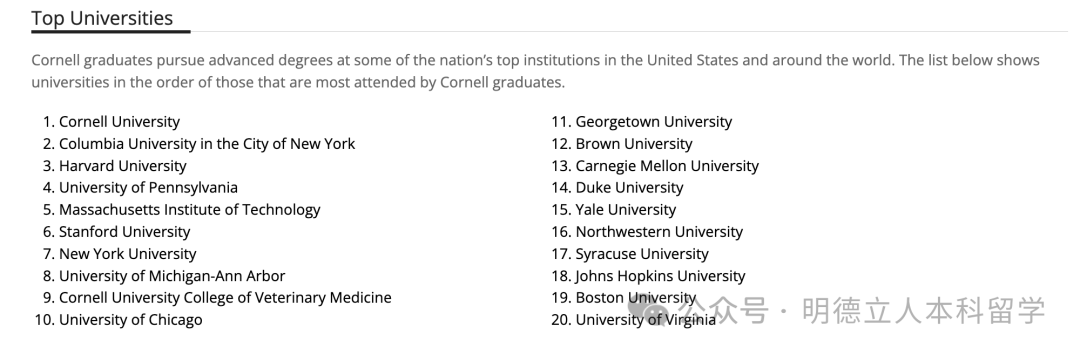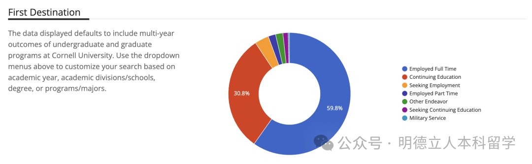 康奈尔本科毕业生的读研率是30.8%,进入最多的大学包括康奈尔、哥大、哈佛、宾大、MIT、斯坦福、纽大、密歇根安娜堡、芝大等。