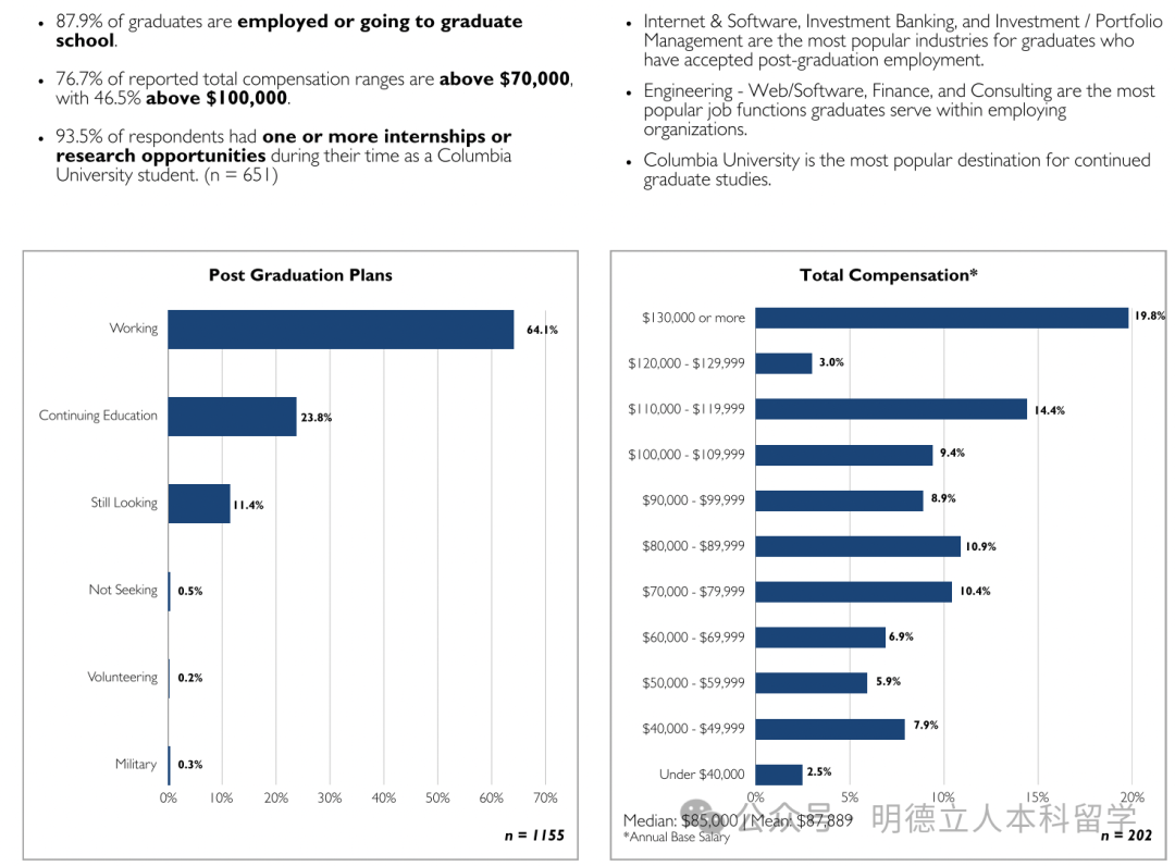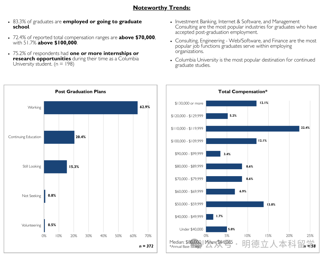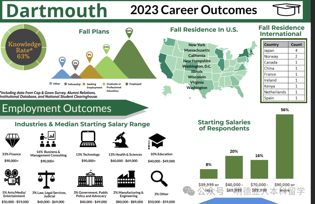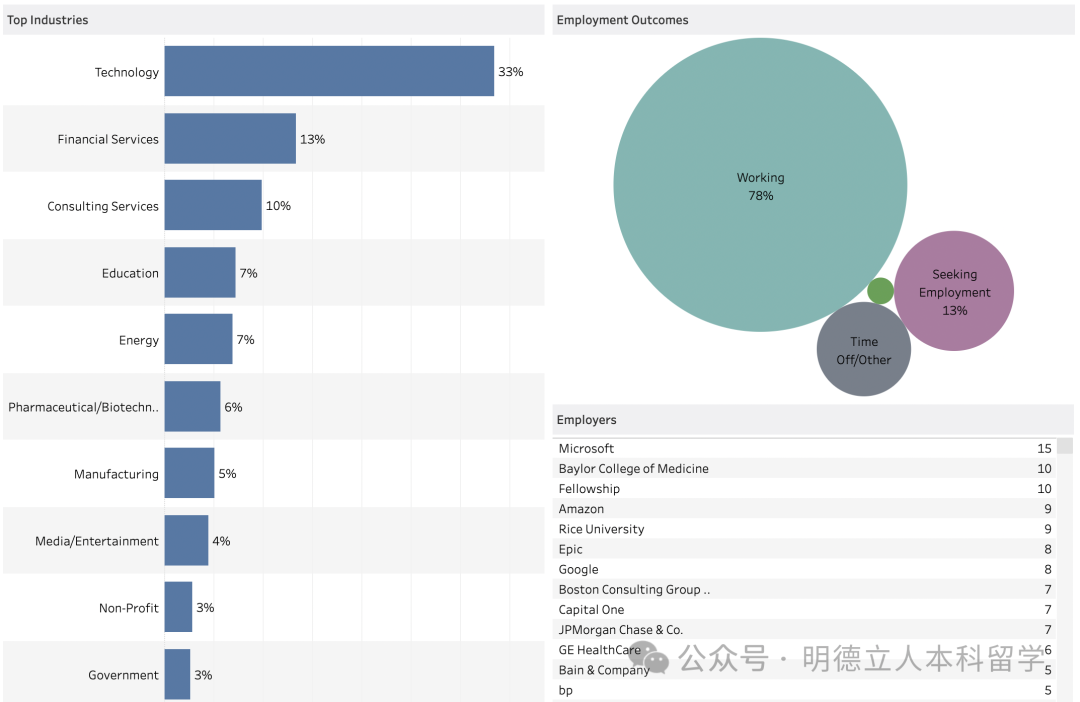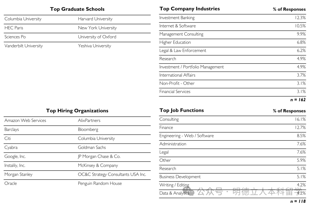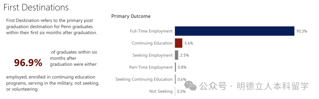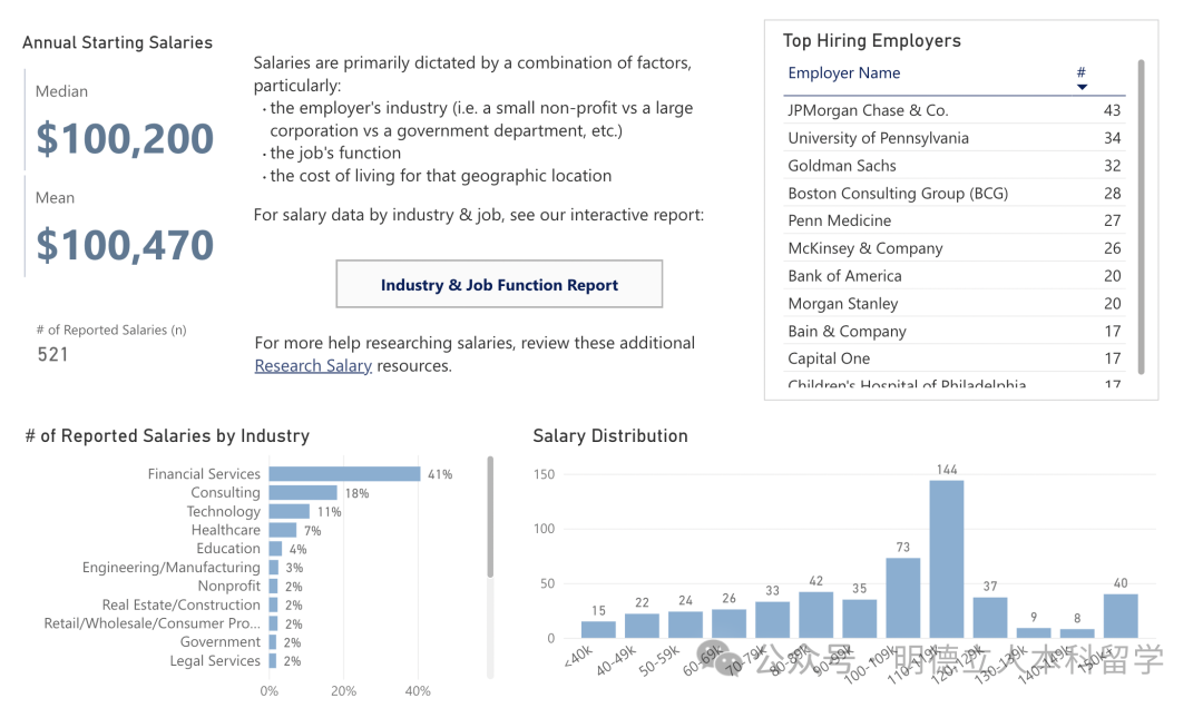 头部雇主包括摩根大通、宾大(留校工作)、高盛、波士顿咨询、宾夕法尼亚医学中心、麦肯锡、美国银行、摩根士丹利、贝恩咨询等。