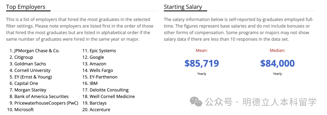 毕业生选择最多的名企有:摩根大通、花旗、高盛、康奈尔(留校工作)、安永、摩根士丹利、美国银行证券、普华永道、微软、Epic 、谷歌、亚马逊等。