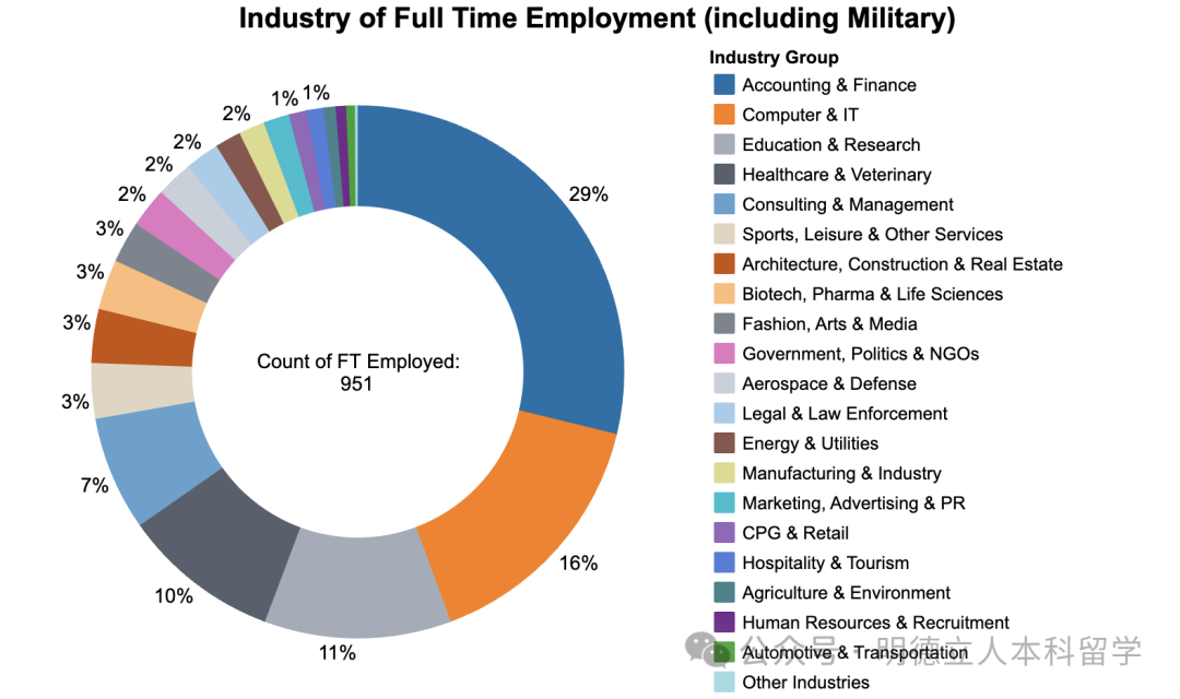 其中24.9%的毕业生进入了金融/保险/房地产行业,这也是就业人数最多的行业;15.1%的毕业生从事学术研究或教育。