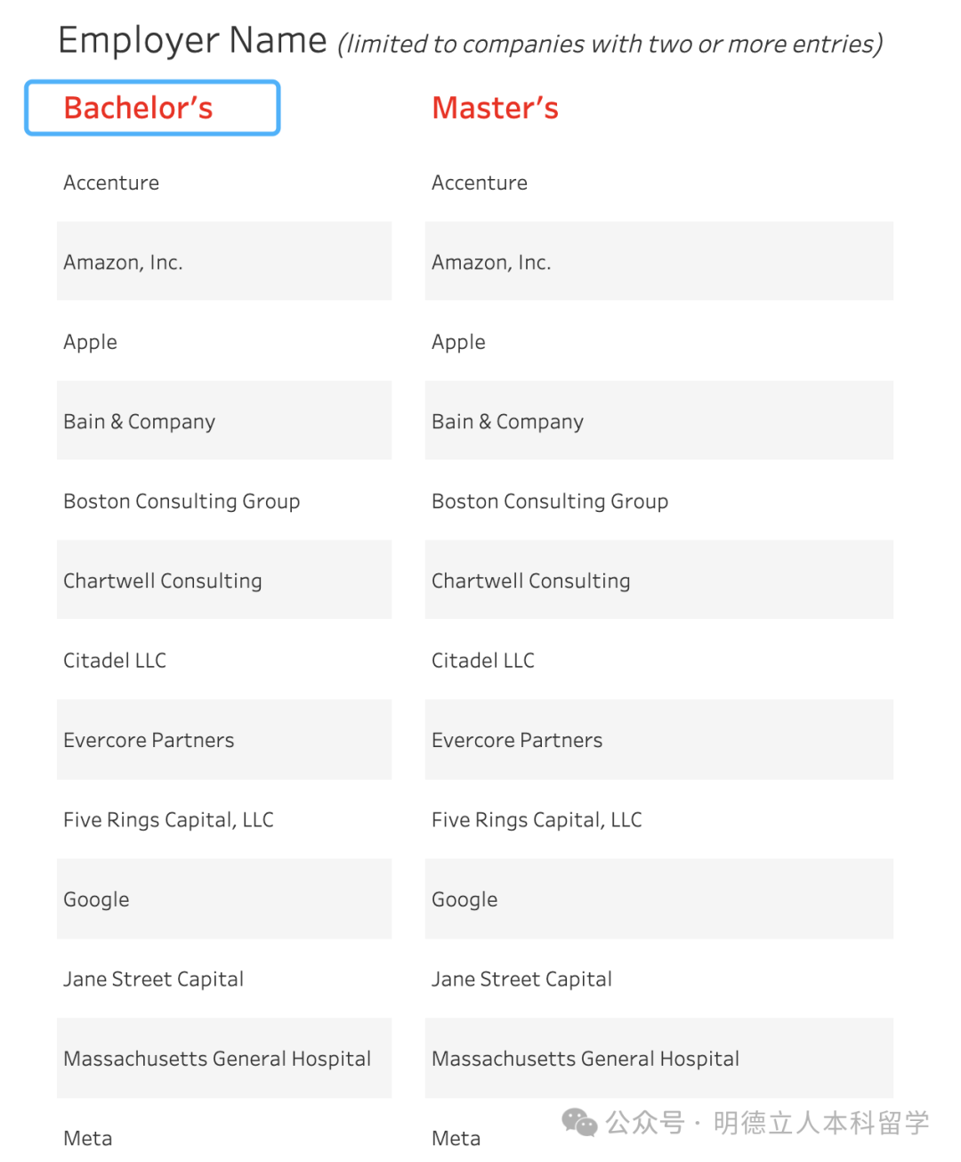 知名雇主有:埃森哲、亚马逊、苹果、贝恩咨询、波士顿咨询集团、Chartwell Consulting、城堡投资(Citadel LLC)、Evercore Partners、Five Rings Captal、谷歌、Meta等。