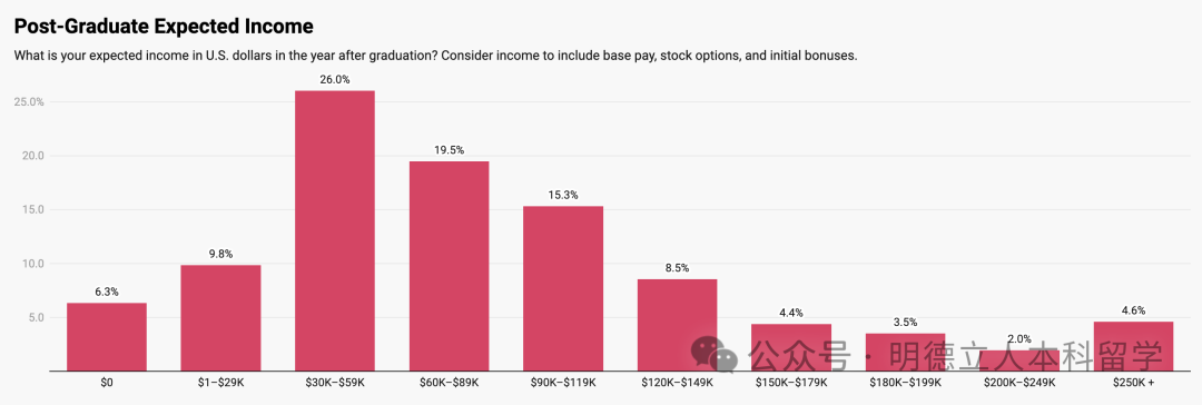 6.6%就业的学生起薪超过了20万美元,尤其是软件工程行业,近四分之一的人能达到这个水平。