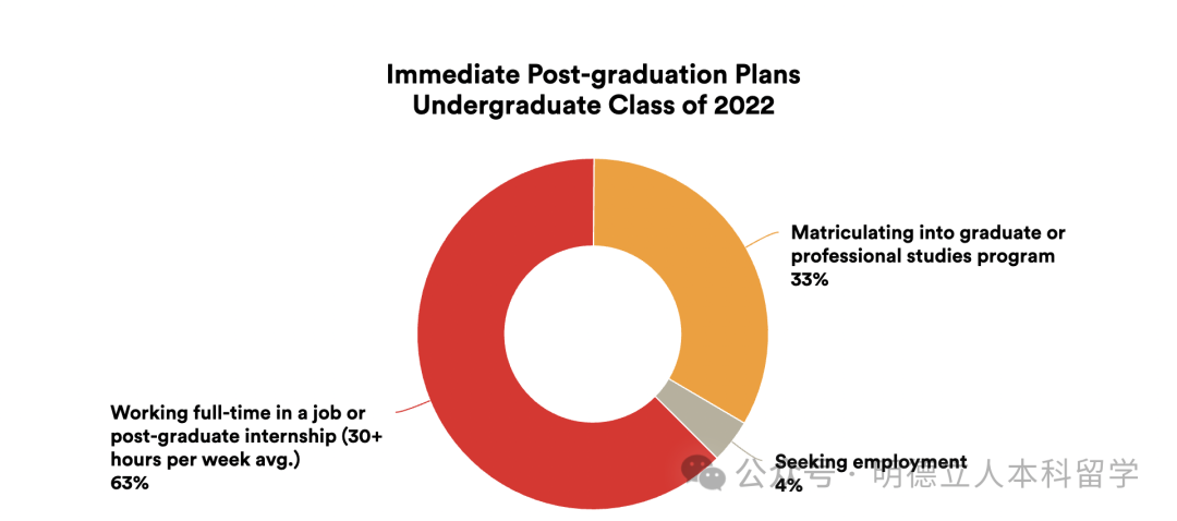 布朗本科毕业生有33%的人继续读研或是专业研究,其中75%是攻读硕士学位,16%选择的是医学。