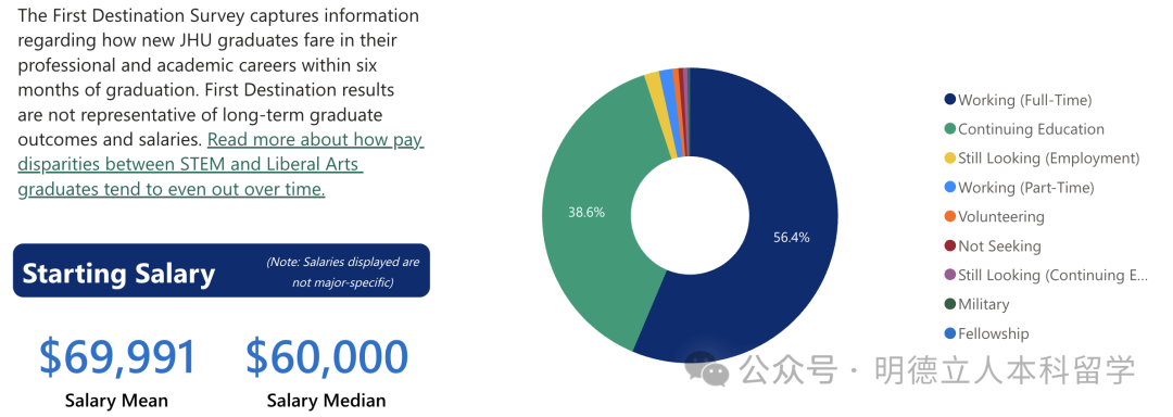 JHU的本科毕业生56.4%的人选择就业,平均年薪为69991美元,约50万元,收入中位数为6万美元,约43万元。