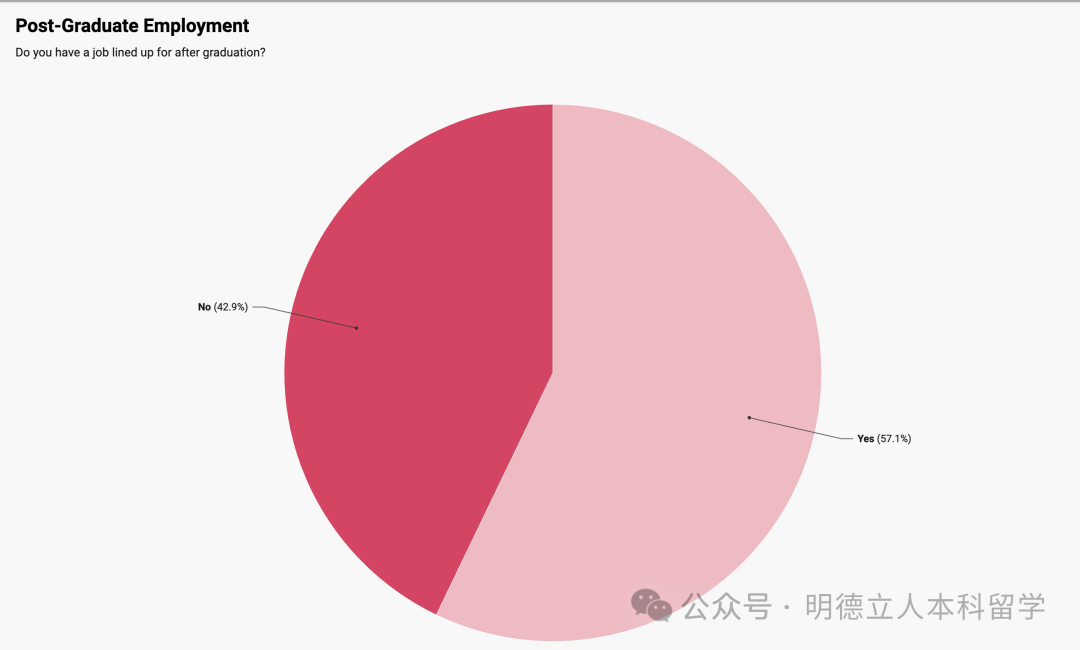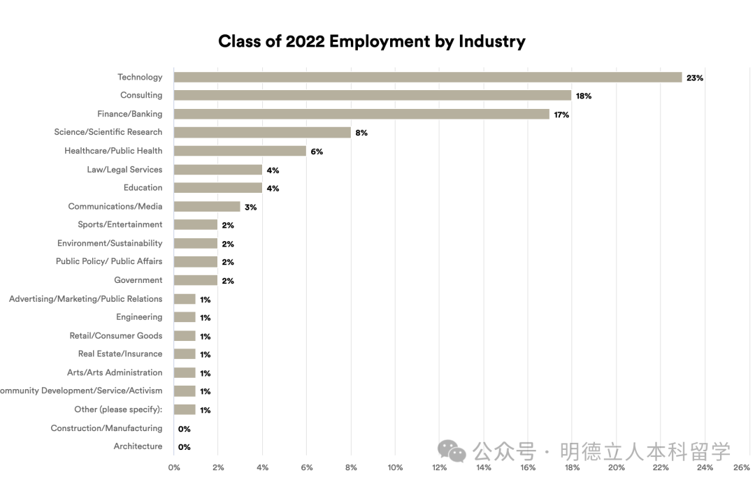 2022届毕业生就业率达63%,其中23%进入的是技术行业,18%是咨询,17%为金融/银行,这是三大最热门的选择。