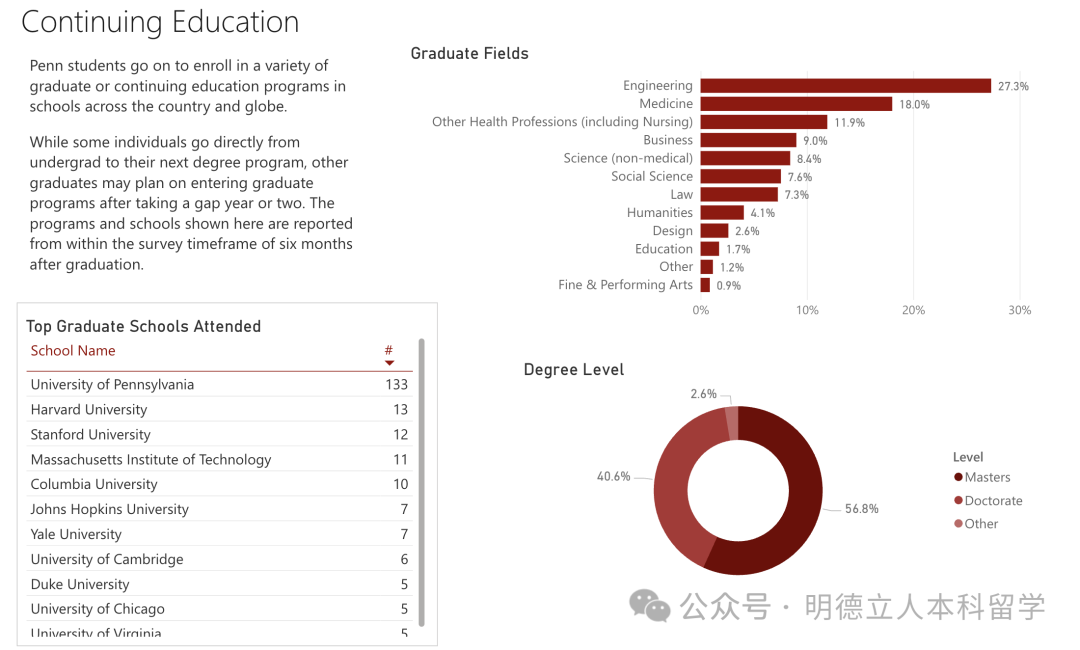 另外,宾大19.6%本科毕业生选择读研,攻读工程学位的人占比27.3%,医学18%。