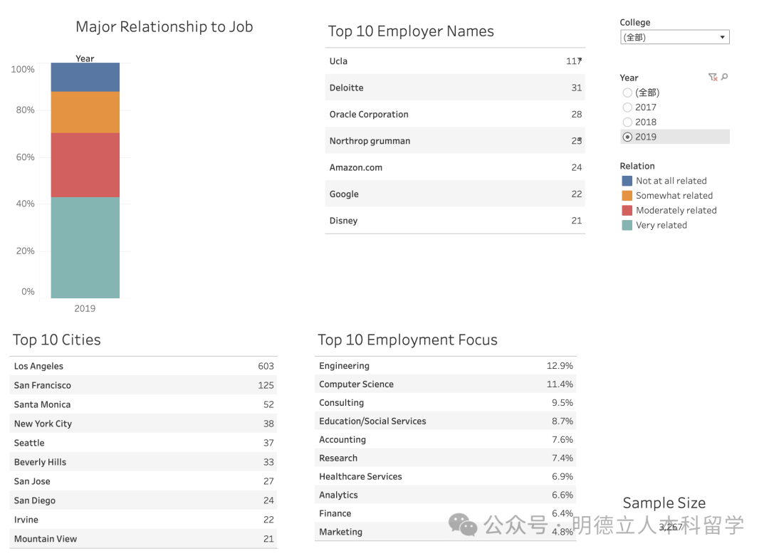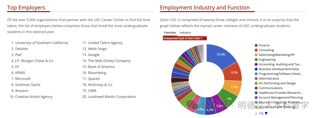 名企雇主有南加大、德勤、PwC、摩根大通、安永、毕马威、微软、高盛、亚马逊、CAA创新艺人经纪公司、UTA联合精英经纪公司等。