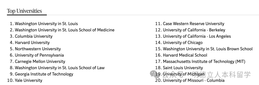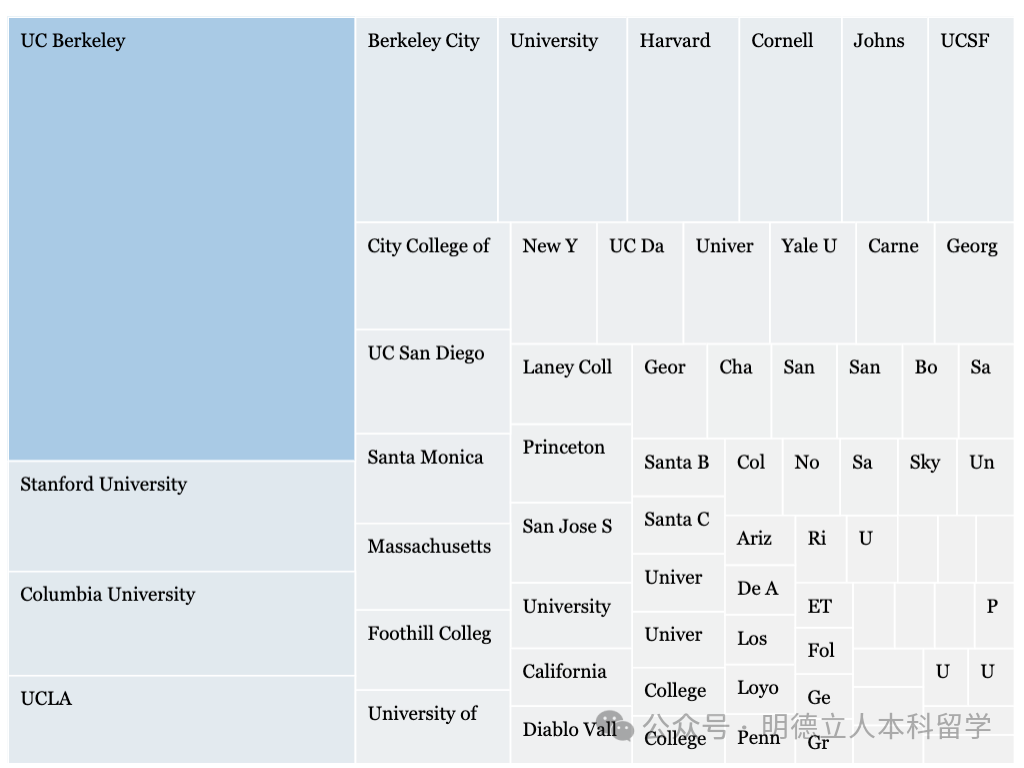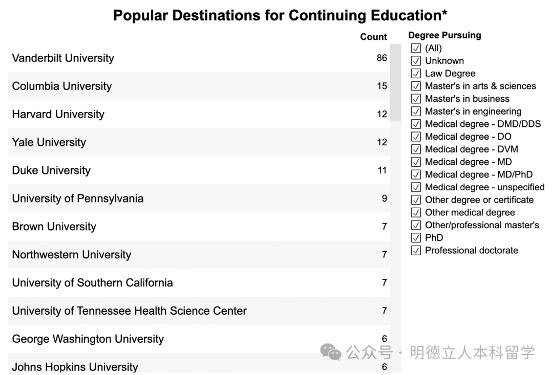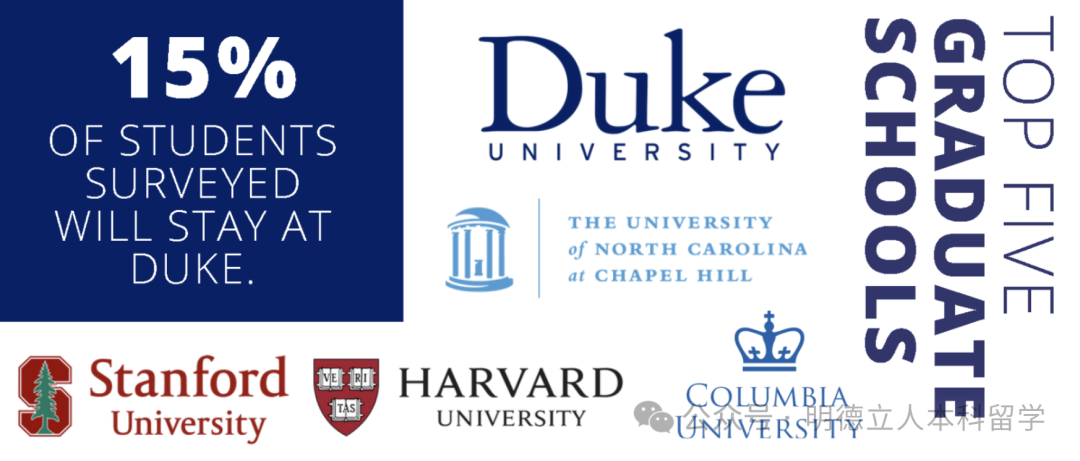 UCN、杜克、北卡罗来纳州立大学、宾大、弗吉尼亚大学、范德堡、乔治城、纽大等校是入读人数最多的学校。