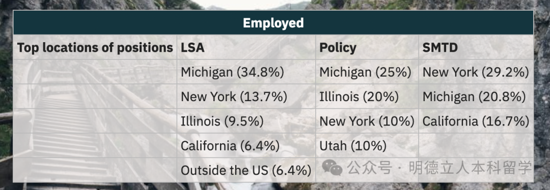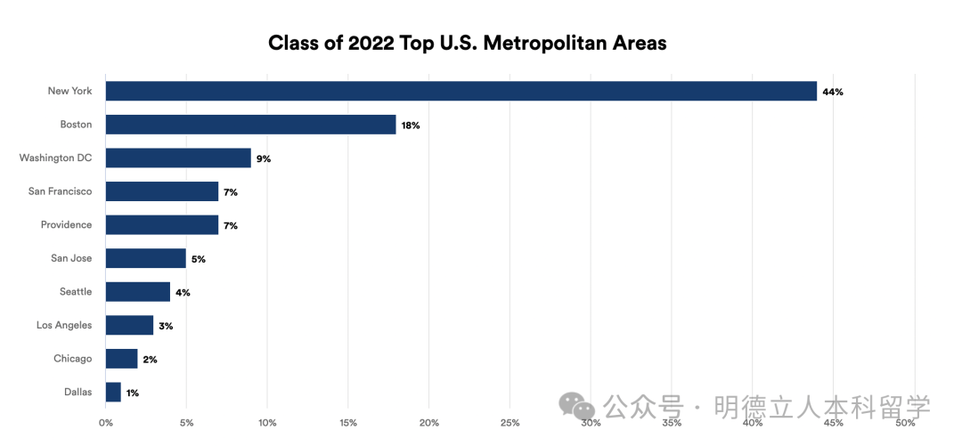 就业学生几乎都在大城市工作,其中44%在纽约、18%的人在波士顿、华盛顿DC也有9%。