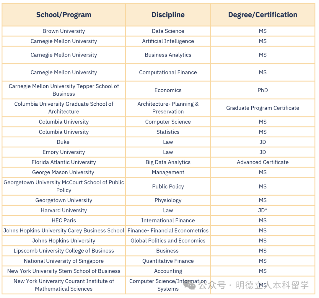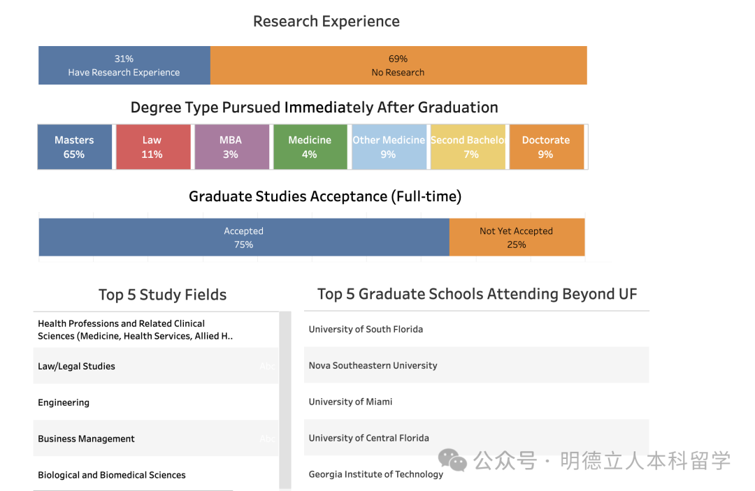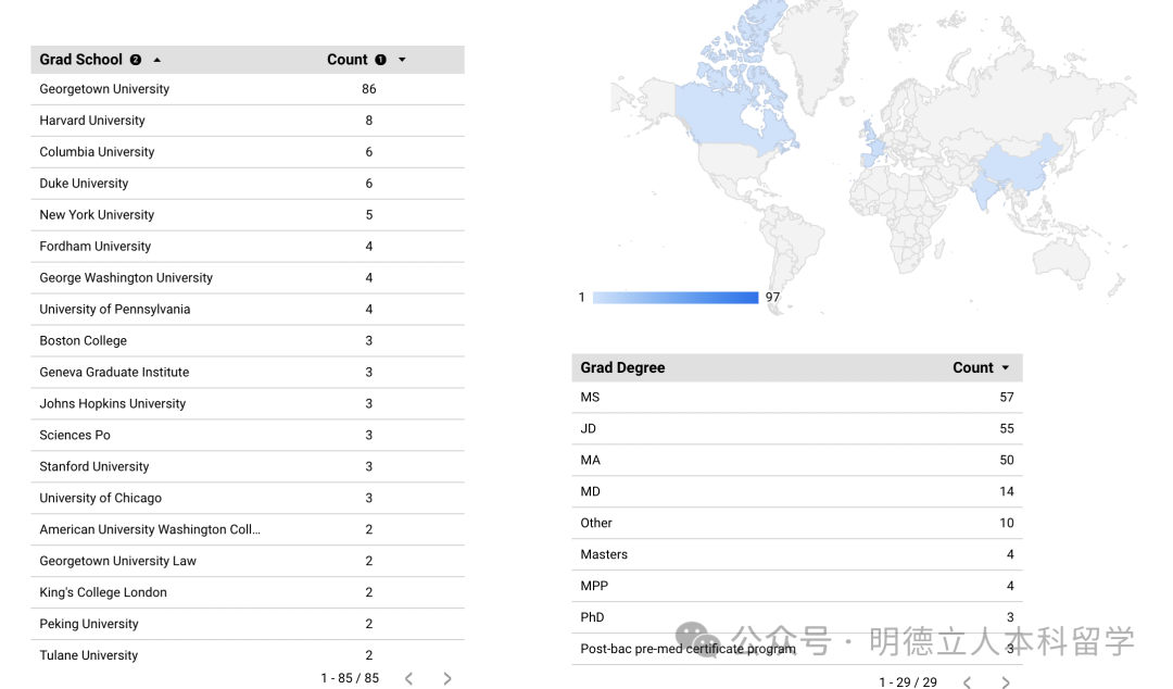 乔治城大学的本科生深造率为17.69%,录取的顶尖大学包括乔治城大学、哈佛、哥大、杜克、纽大、宾大、JHU、斯坦福、芝大等。