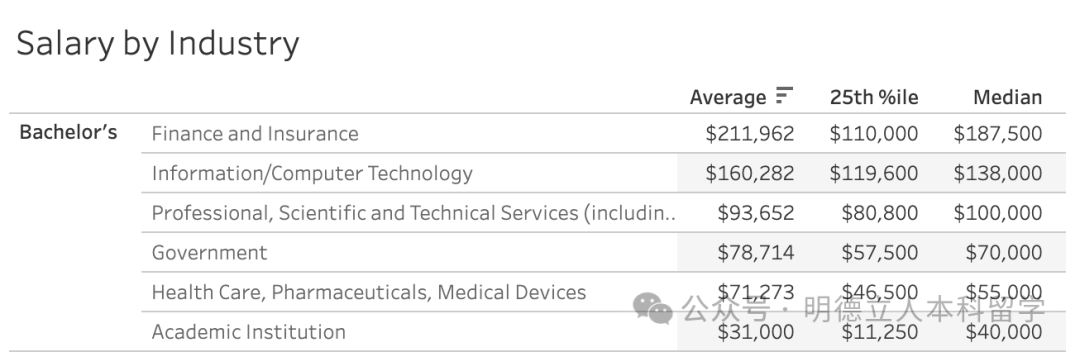 根据就职行业来看,金融和保险行业薪资最高,平均起薪211962美元(151万元),最低的学术机构是31000美元(22万元)。