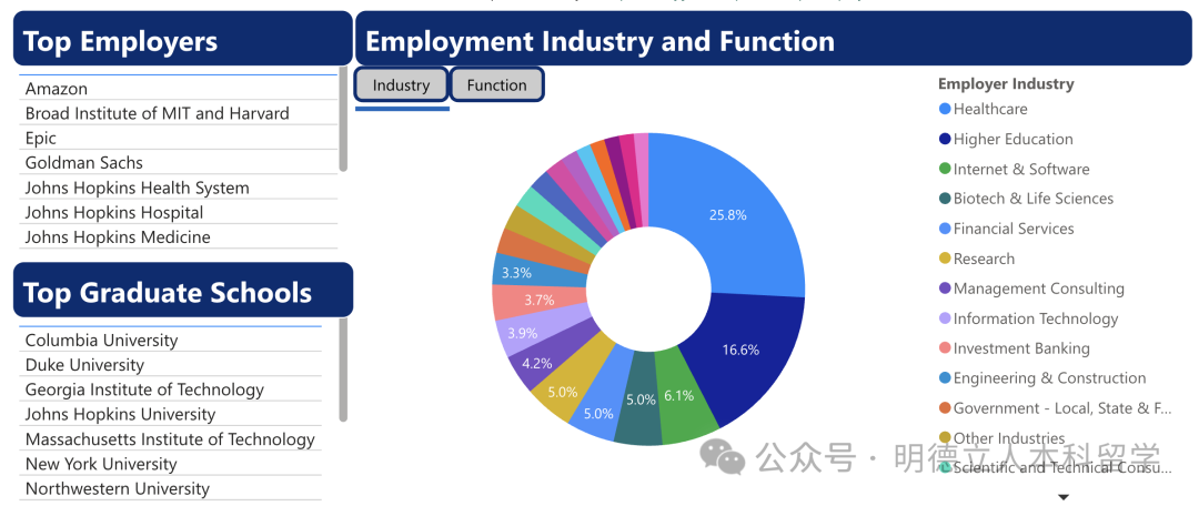 JHU毕业生25.8%进入医疗保健行业,16.6%选择高等教育行业,6.1%是互联网&软件,最大雇主包括:亚马逊、MIT和哈佛研究所、Epic、高盛等。
