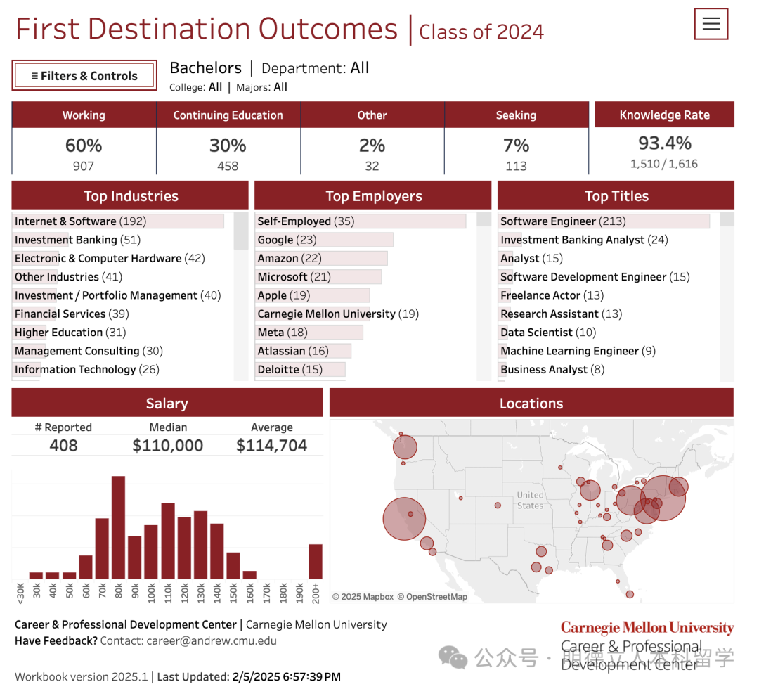 CMU的2024届本科毕业生读研率30%,就业率为60%,平均年薪高达114,704美元,约82万,比很多藤校都高,不愧是宇宙最强CS神校!