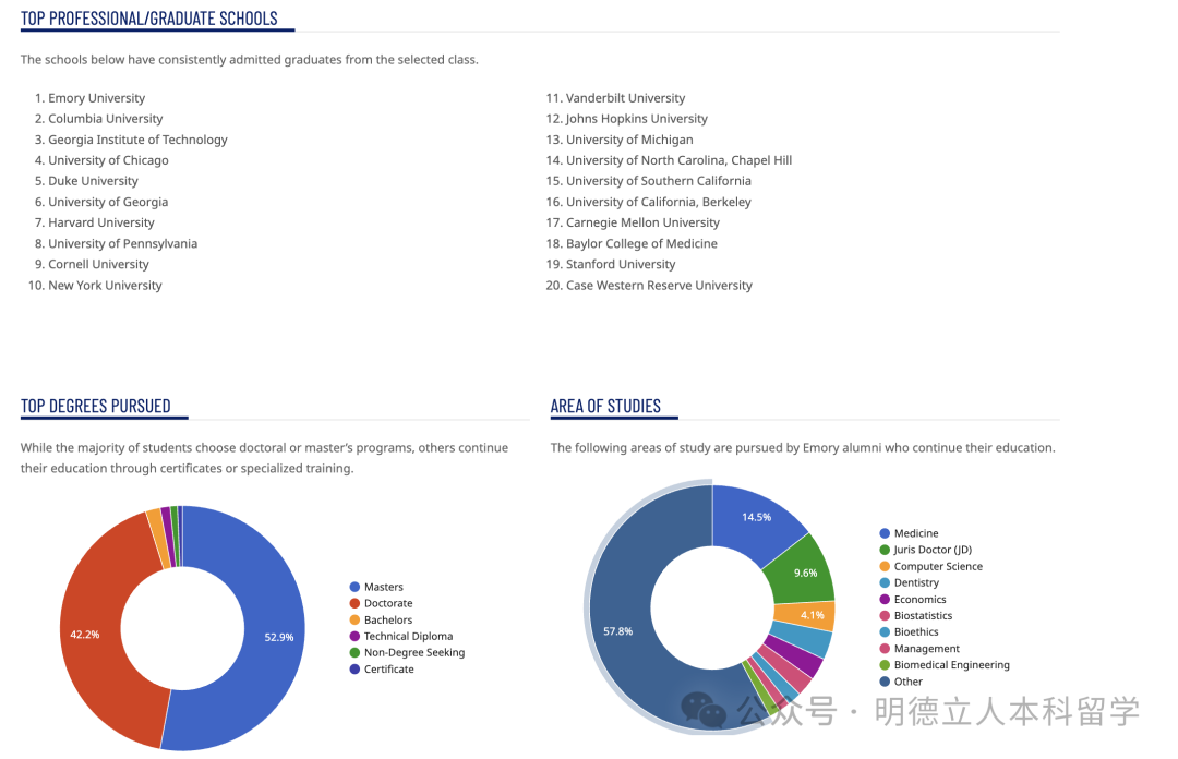 埃默里本科毕业生深造率37.6%,入读的名校包括:埃默里大学、哥大、佐治亚理工、芝大、杜克、哈佛、宾大、康奈尔、纽大、范德堡大学、JHU、密歇根大学、斯坦福等。