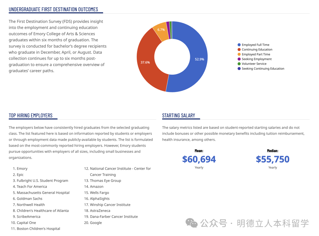 埃默里2024届毕业生的就业率为52.9%,平均起薪是60694美元(44万元),薪酬中位数55750美元(40万元)。
