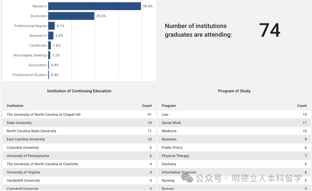 UNC本科毕业生的深造率为11.9%,其中59.4%的人会读硕士学位。
