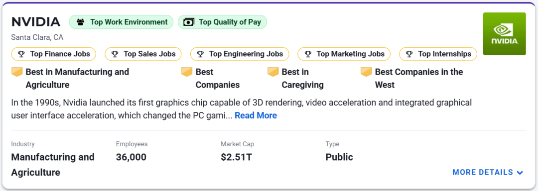 美国顶尖制造业与农业公司,如英伟达、约翰迪尔,主要招聘机械工程、电子工程、计算机科学、材料科学及农业工程等专业学生。