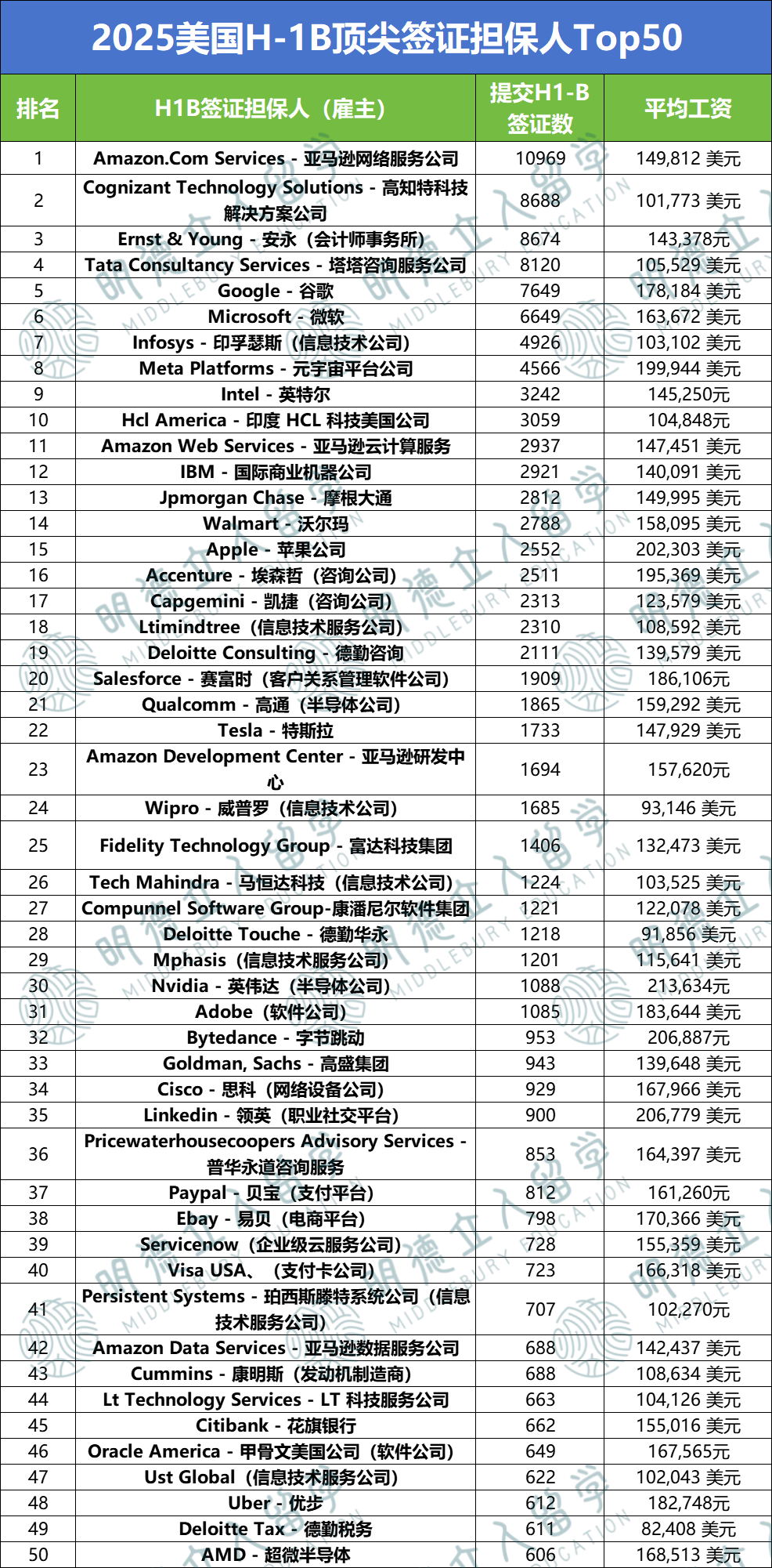 先来看MyVisaJobs网站根据官方数据整理的2025年度(2024财年)美国H-1B顶尖签证担保人的Top50排名,当时,这份榜单并未受到最新签证政策的影响: