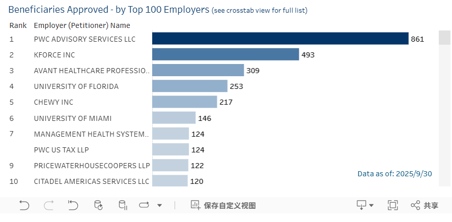 图 | 美国移民局H-1B雇主数据中心-佛罗里达州雇主前100名