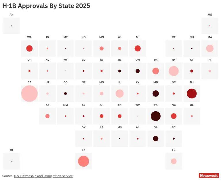 图源《新闻周刊》(Newsweek) | H-1B签证批准量的州分布图