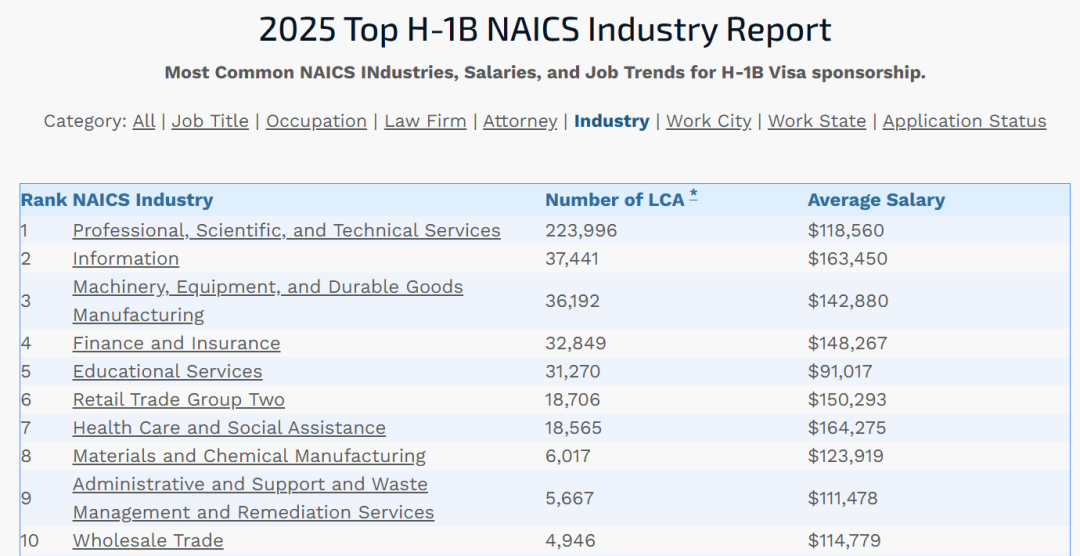 2、在就业行业选择上,根据http://myvisajob.com发布的《2025 H-1B 签证报告》,科技行业、信息、机械制造、金融行业最容易拿到Sponsor,同时STEM专业的硕士博士等高学历学生最有竞争力。