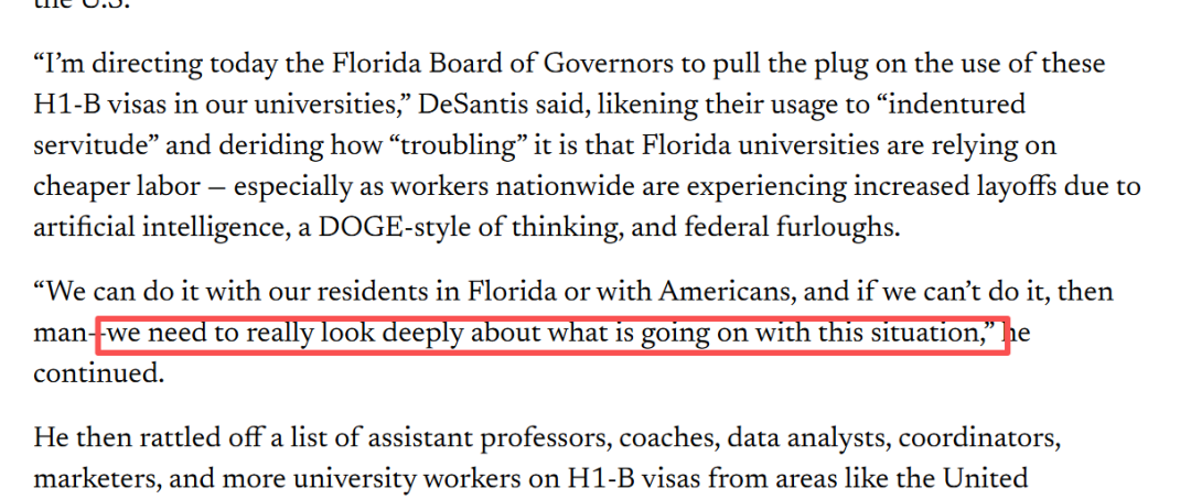 紧接着佛州州长开了个发布会,说目前已指示佛罗里达州最高高等教育委员会,阻止州立大学雇佣持有H-1B签证的外国专业技术人员。