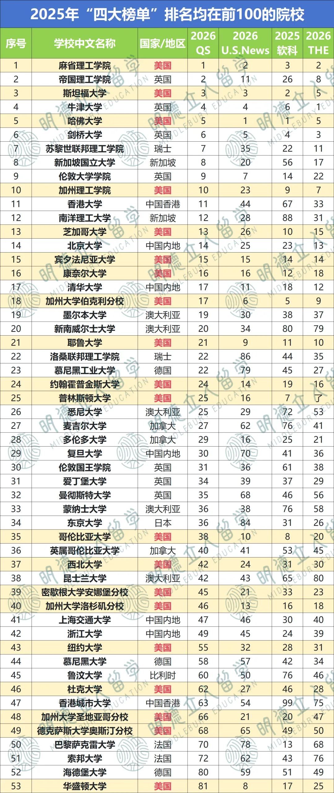 小德之前也统计了《四大排名均在前100名的学校》,共有53所。这些院校在学术,还是就业和声誉上竞争力都非常强!回国的认可度也高,落户政策、海归补贴、人才计划都适用。