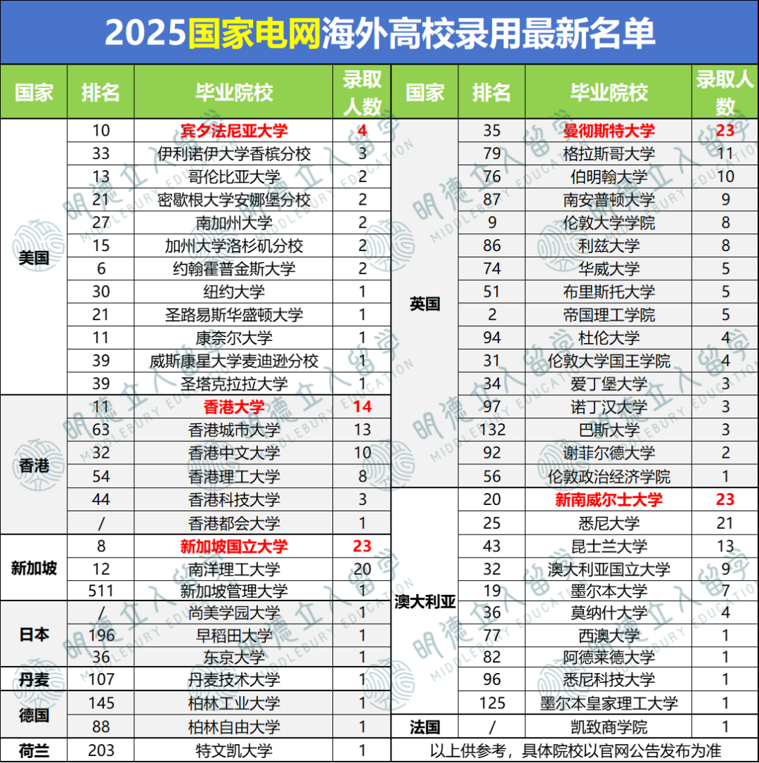 国企在招聘留学生时,通常喜欢招聘来自顶尖学府的同学,尤其是QS、泰晤士权威排名前100、前50的院校。