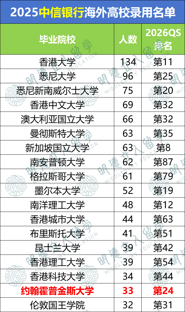 香港大学以134人高居榜首,接下来是悉尼大学和信南威尔士大学;美国院校只有约翰霍普金斯大学(JHU)上榜,共录取了33个人。