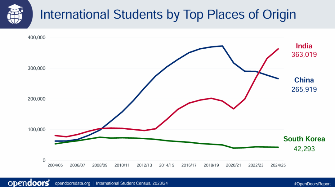 从生源国上看,印度学生数量本学年增幅达9.5%,总人数突破36.3万,创历史新高。
