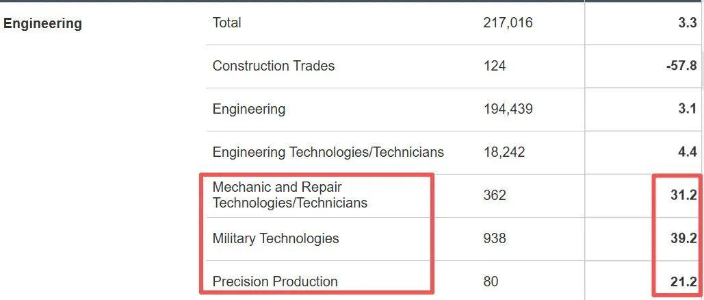 同样是热门专业的工程专业中,建筑行业人数下降了一半多,而机械与维修技术/技术人员、军事技术、精密制造对比上一年,就读人数增加明显!
