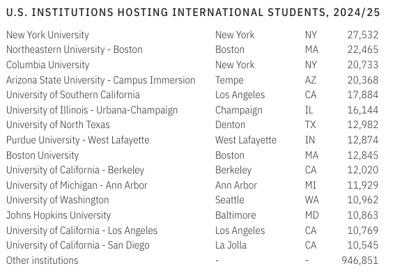 纽约大学登上榜首,在24-25学年,招收了最多的国际生!