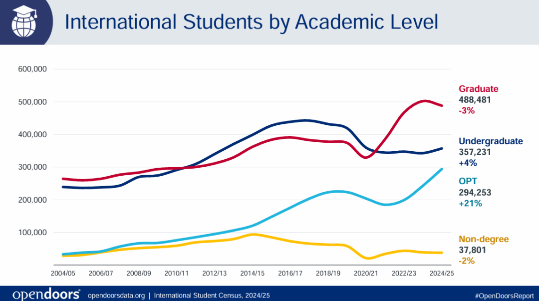 赴美的本科学生同比上涨4.2%、研究生人数最多但小幅下降,拿到OPT身份人数同比上涨21.2%,涨幅明显!