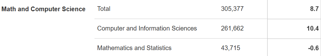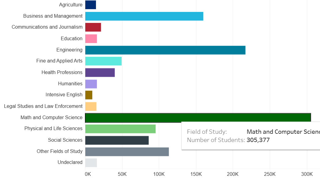 其中,数学和计算机科学专业最受欢迎,就读人数占比约26%,有305,377人选择;