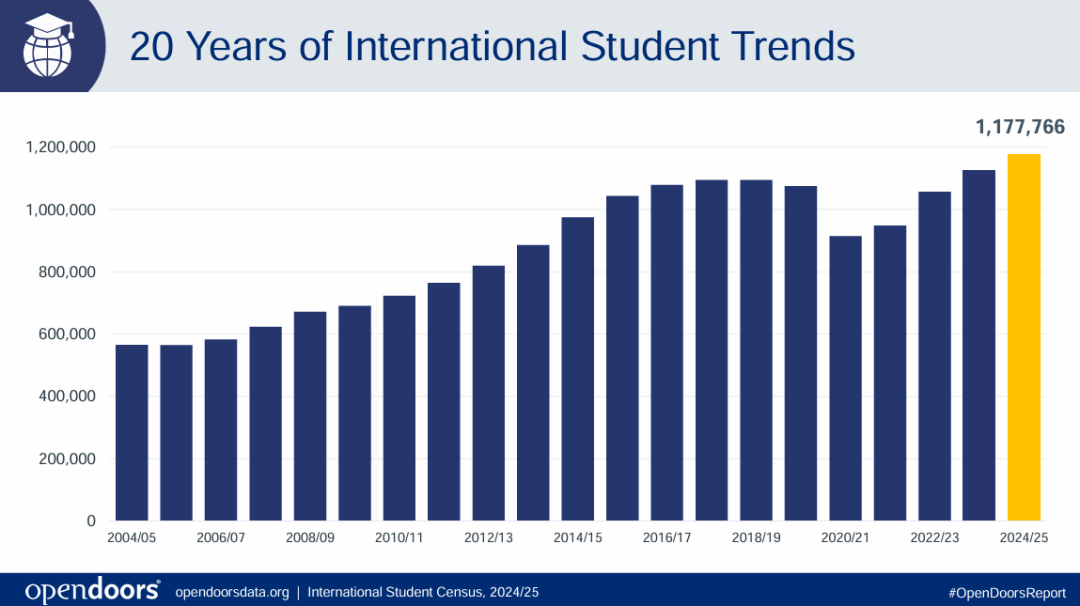 2024/25学年,美国招收了来自200多个地区,总共约1,177,766名国际学生,在美国高等教育机构学习,较上一学年增长4.5%,创新高!