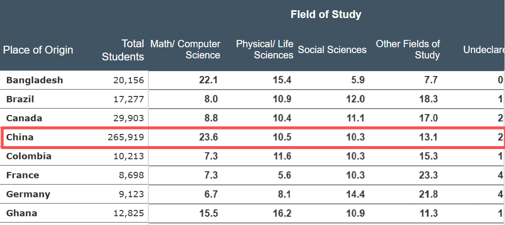 对于中国大陆学生来说,选择人数最多的领域却依然是数学及计算机科学类(占比约23.6%)且逐年增加,今年最高。